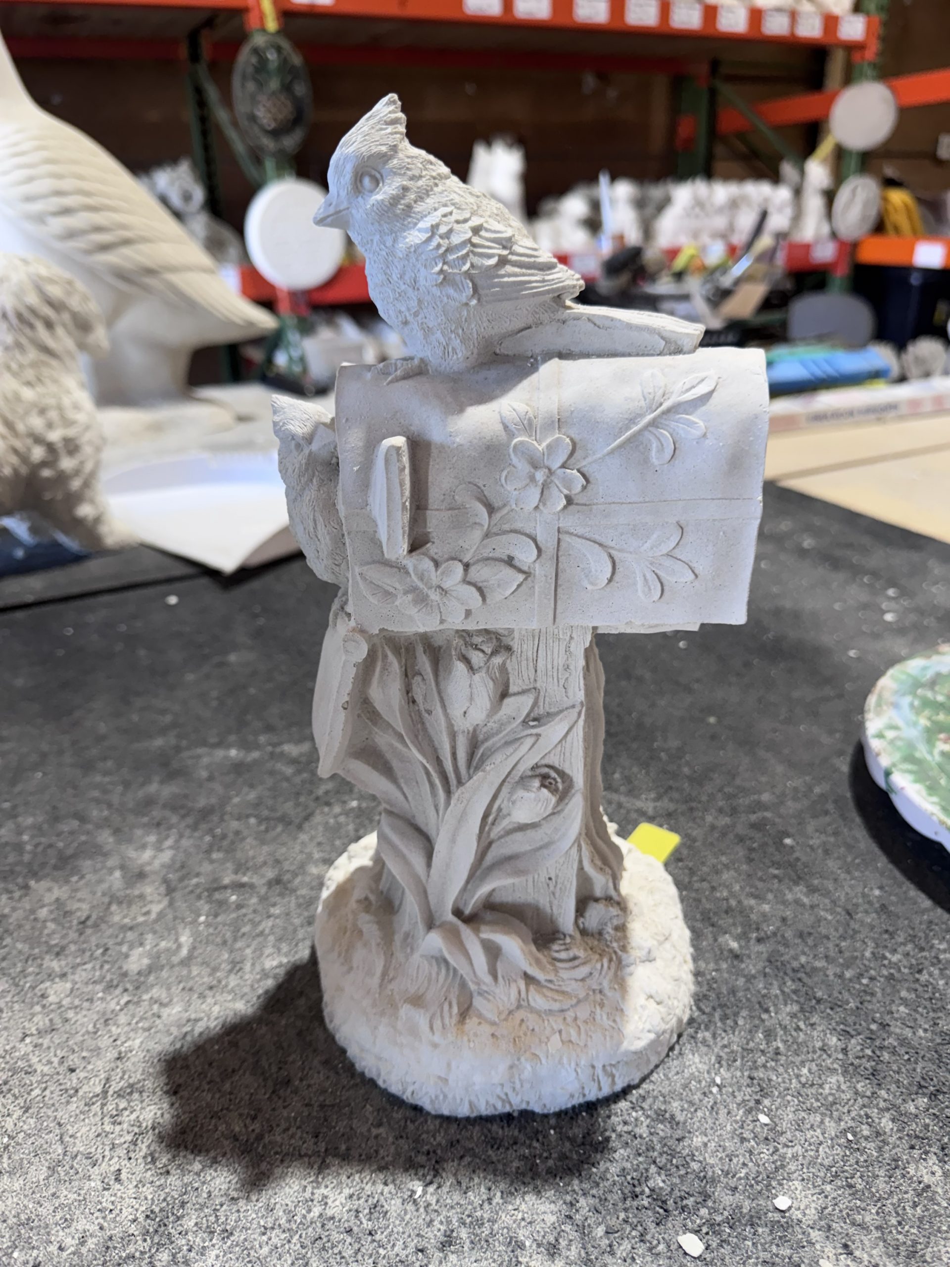 All of our statues are made out of concrete. Most items have some sort of support added to the statue such as rebar or aluminum wire throughout the piece to add strength.