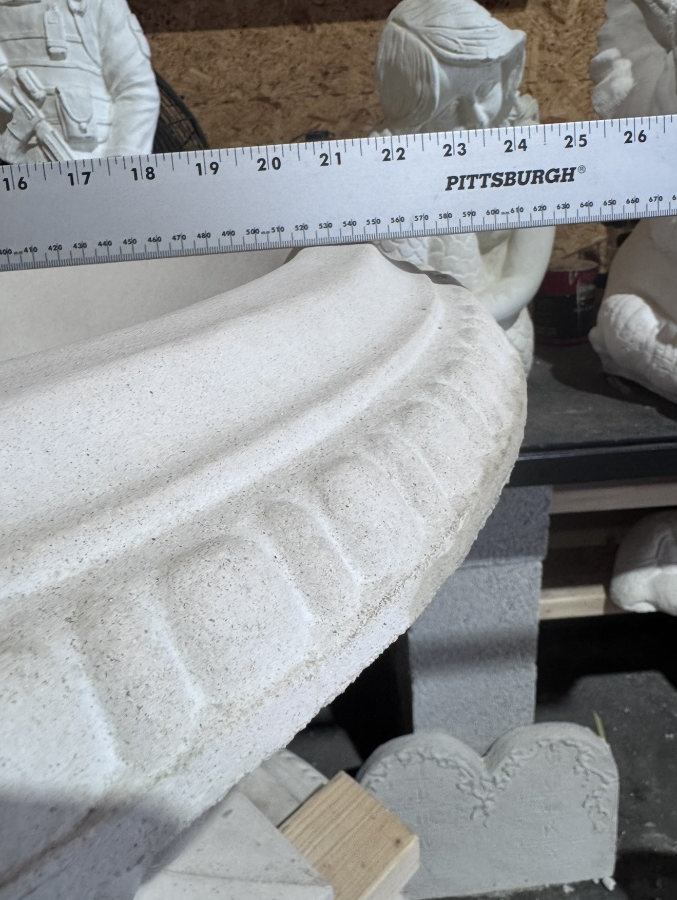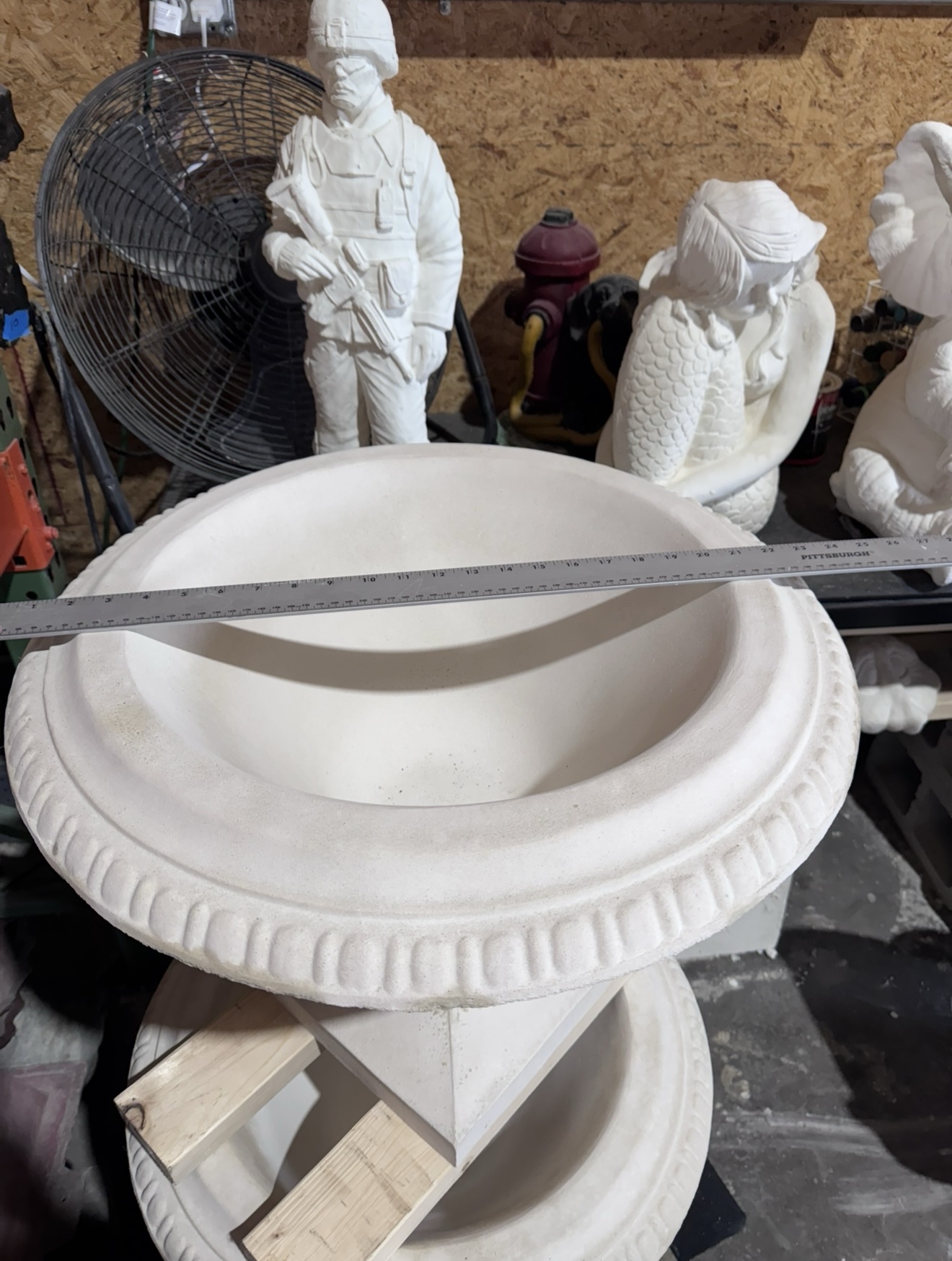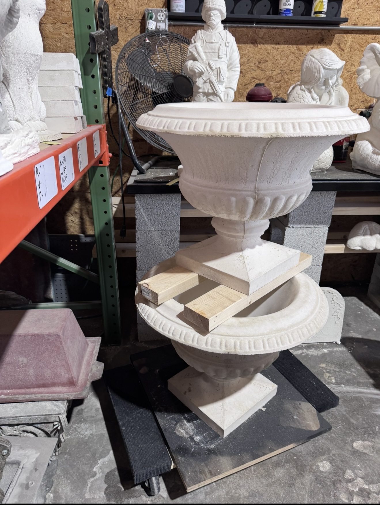 All of our statues are made out of concrete. Most items have some sort of support added to the statue such as rebar or aluminum wire throughout the piece to add strength.