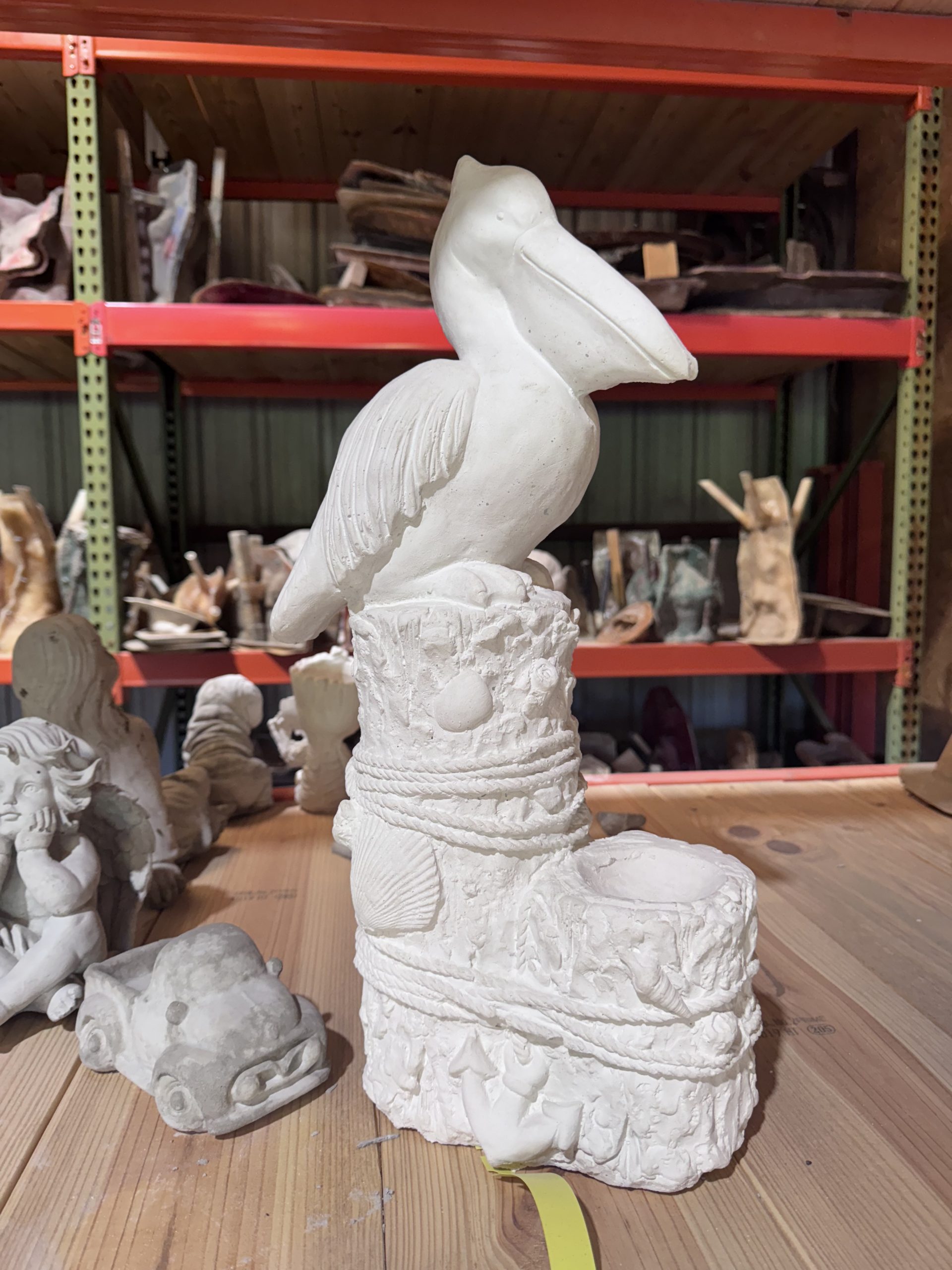In a nutshell we make all our statues by mixing concrete and pouring it into molds. Once the statue is out of the mold it is solid raw concrete. At that point, the pieces would contain no finishes on them. No sealers, colorful paint, white paint, nothing…. Zilch… Nada…